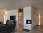 Strakke inbouw houthaard van Rüegg met elegante draaideur.